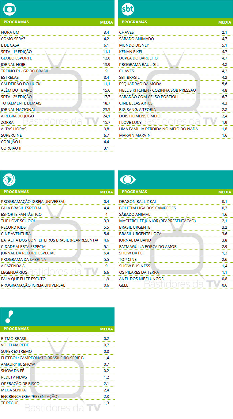 Audiências consolidadas de sábado (14/11)