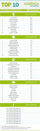 Campinas: confira as audiências do Top 10 de 30 de janeiro a 5 de fevereiro Alex Klein 8 de fevereiro de 2017 Compartilhar: