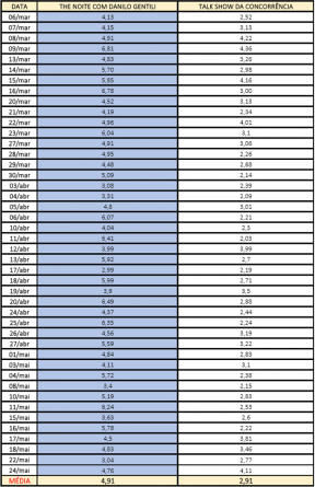 Foi a 44ª vez consecutiva que o The Noite levou a melhor no confronto desde a estreia das duas atrações na atual temporada, no dia 06 de março. Além de vencer todos os duelos, o talk show comandado por Danilo Gentili acumula média de 4,9 pontos de média no período – de 6 de março a 24 de maio. Índice 70% superior ao alcançado pelo programa concorrente no horário que estão simultaneamente no ar.
