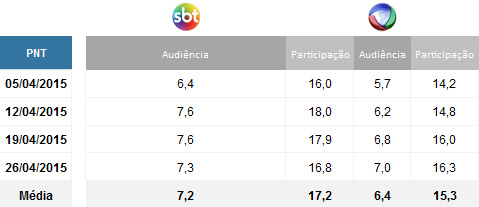 Já no PNT, o programa marcou 7,2 pontos de média e também encerrou o mês de abril em segundo lugar isolado no ranking das audiências. No mesmo período, a Record ficou com 6,4 pontos. Cada ponto equivale a 233 mil domicílios no Painel Nacional de Televisão.