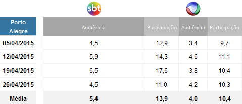 Em Porto Alegre, o “Domingo Legal” também fechou na vice-liderança isolada. Ao longo dos quatro domingos de abril, a atração de Celso Portiolli registrou 5,4 pontos de média contra 4.0 da Record. Cada ponto equivale a 27 mil domicílios na Grande Porto Alegre.