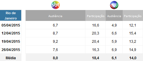No Rio de Janeiro, o dominical do SBT superou a concorrência nos quatro finais de semana e fechou o mês com 8.0 pontos de média contra 6,1 da Rede Record. Cada ponto equivale a 42 mil domicílios no Rio de Janeiro.