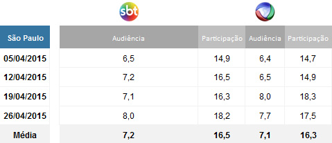 Em São Paulo, o “Domingo Legal” venceu três dos quatro confrontos com o “Domingo Show” e encerrou o mês de abril com 7,2 pontos de média. No mesmo período, a Record ficou em terceiro lugar, com 7,1 pontos. Cada ponto equivale a 67 mil domicílios na Grande São Paulo.