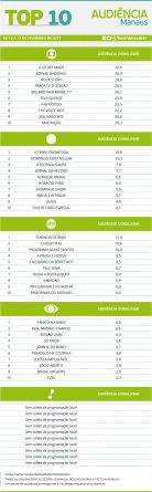 Manaus: confira as audiências do Top 10 de 13 a 19 de fevereiro Alex Klein 21 de fevereiro de 2017 Compartilhar: