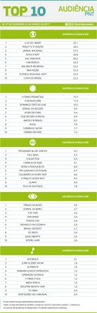 Painel Nacional de Televisão: confira as audiências do Top 10 de 27 de fevereiro a 5 de março Alex Klein 7 de março de 2017 Compartilhar: