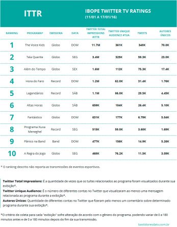 Programas mais comentados no Twitter de 11 a 17 de janeiro Alex Klein 20 de janeiro de 2016 Compartilhar: