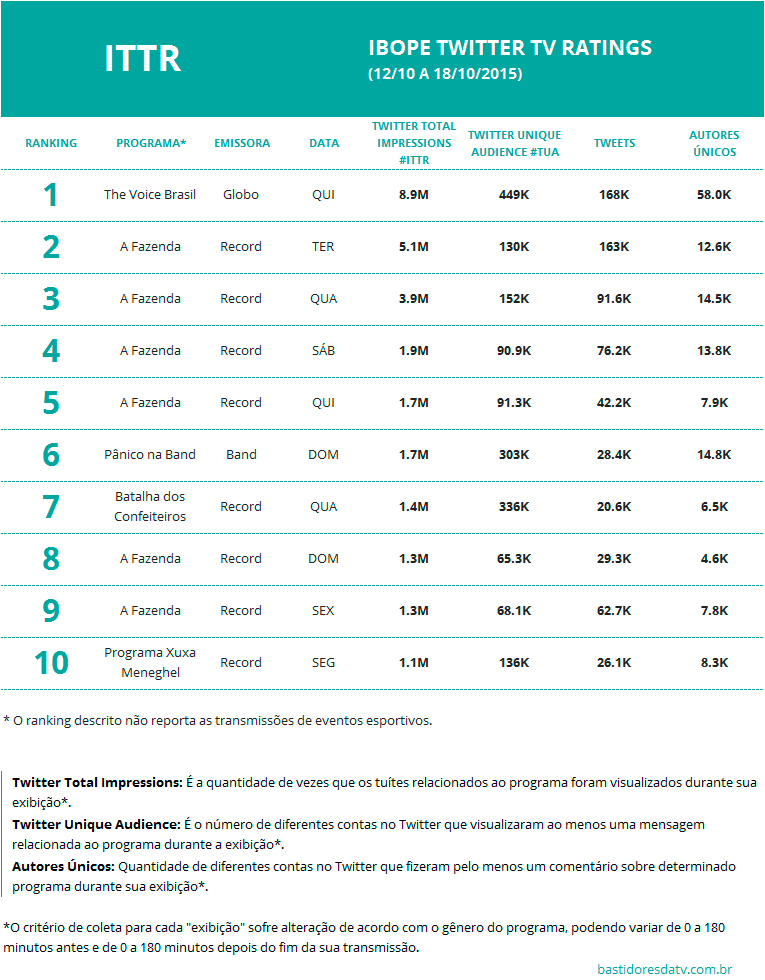 São consideradas pelo ITTR todas as emissoras de TV aberta de cobertura nacional. A posição dos programas no ranking é baseada no total de impressões.