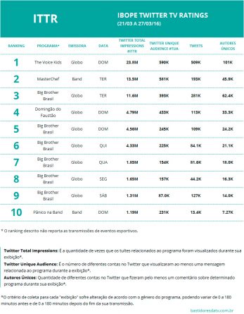 Programas mais comentados no Twitter de 21 a 27 de março Alex Klein 31 de março de 2016 Compartilhar: