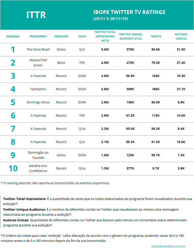 São consideradas pelo ITTR todas as emissoras de TV aberta de cobertura nacional. A posição dos programas no ranking é baseada no total de impressões.