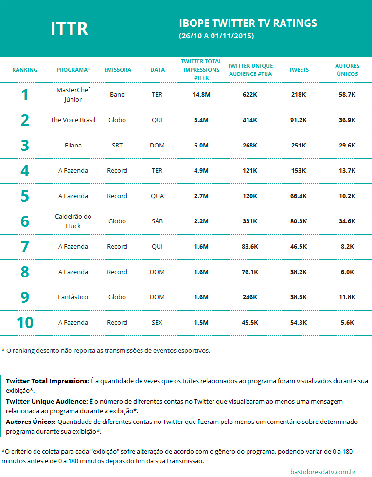 São consideradas pelo ITTR todas as emissoras de TV aberta de cobertura nacional. A posição dos programas no ranking é baseada no total de impressões.