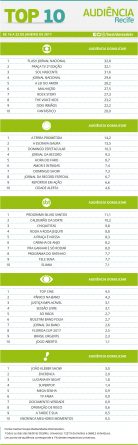 Recife: confira as audiências do Top 10 de 16 a 22 de janeiro Alex Klein 24 de janeiro de 2017 Compartilhar: