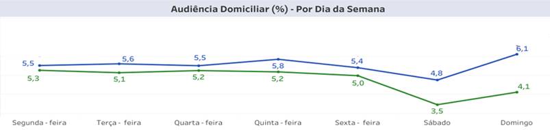 Além da vice-liderança na média mensal, o SBT também superou a emissora terceira colocada na média de todos os dias da semana, sendo aos domingos os melhores desempenhos: