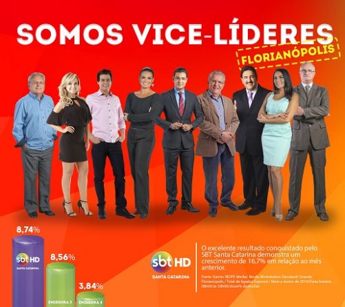 O SBT Santa Catarina conquistou a vice-liderança na Grande Florianópolis durante o mês junho, com uma participação média de 8,74%, durante as 24 horas, de segunda a domingo. No mesmo período pesquisado, a RICTV (Record) registrou 8,56% de share e a Band obteve 3,84%¹. O excelente resultado conquistado pelo SBT Santa Catarina demonstra um crescimento de 16,7% em relação ao mês anterior.
