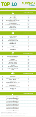 Top 10: as maiores audiências das emissoras em Goiânia (01/08 a 07/08) Alex Klein 9 de agosto de 2016 Compartilhar:
