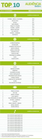 Top 10: as maiores audiências em Belém entre os 5 e 11 de setembro Alex Klein 13 de setembro de 2016 Compartilhar: