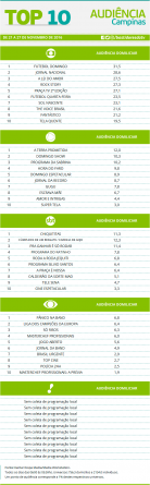 Top 10: as maiores audiências em Campinas entre os dias 21 e 27 de novembro Alex Klein 29 de novembro de 2016 Compartilhar: