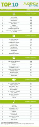 Top 10: as maiores audiências em São Paulo entre os dias 12 e 18 de setembro Alex Klein 20 de setembro de 2016 Compartilhar: