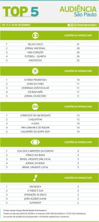 Top 5: programas de maior audiência em São Paulo de 12 a 18 de setembro Alex Klein 30 de setembro de 2016 Compartilhar: