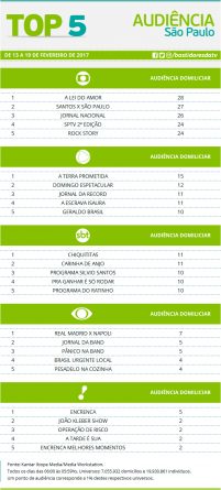 Top 5: programas de maior audiência em São Paulo de 13 a 19 de fevereiro Alex Klein 3 de março de 2017 Compartilhar: