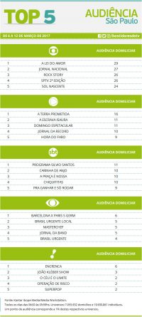 Top 5: programas de maior audiência em São Paulo de 6 a 12 de março Alex Klein 23 de março de 2017 Compartilhar: