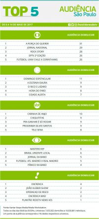 Top 5: programas de maior audiência em São Paulo de 8 a 14 de maio Alex Klein 25 de maio de 2017 Compartilhar: