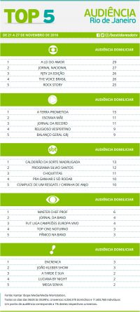 Top 5: programas de maior audiência no Rio de Janeiro de 21 a 27 de novembro Alex Klein 8 de dezembro de 2016 Compartilhar:
