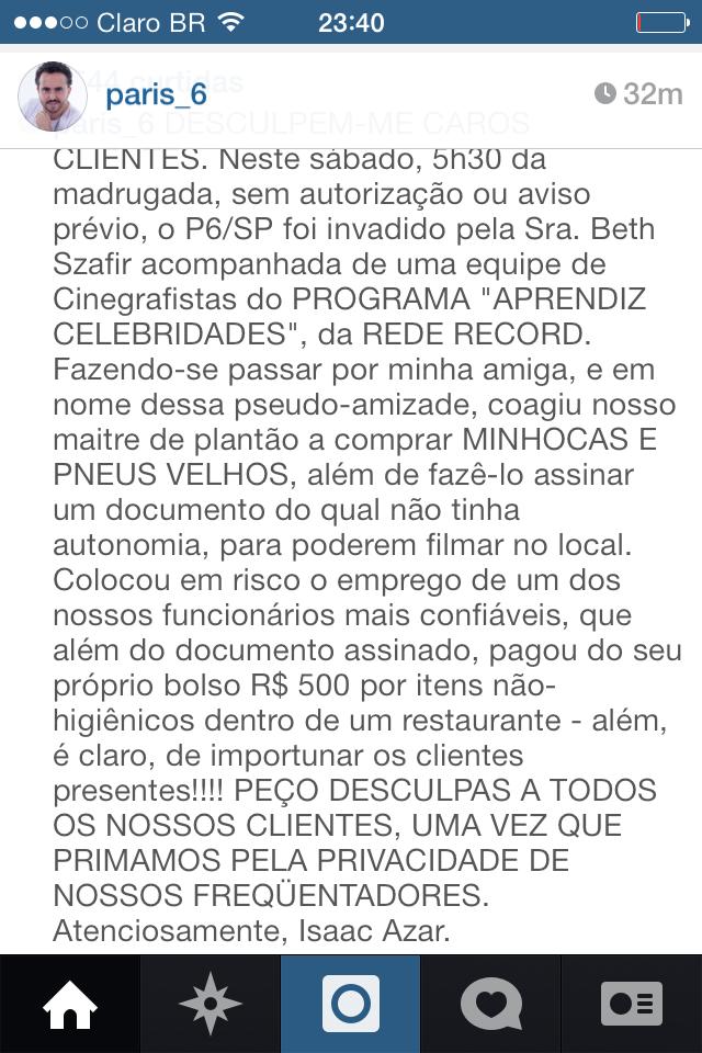 Mas agora a historia é outra, Beth Szafir invadiu o restaurante ‘Paris 6’, localizado em São Paulo, sem ordens para uma gravação do programa ‘Aprendiz’ da Rede Record, isso é o que afirma Isaac Azar, proprietário do estabelecimento. No perfil em que o restaurante possui no Instagram, Isaac Azar comentou o ocorrido e pediu desculpas aos seus clientes. Confira: