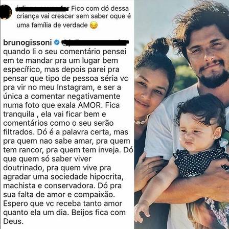 Bruno leu o ataque e se manifestou. “Quando li o seu comentário, pensei em te mandar pra um lugar bem específico, mas depois parei pra pensar que tipo de pessoa seria você pra vir no meu Instagram e ser a única a comentar negativamente numa foto que exala amor. Fica tranquila, ela vai ficar bem, e comentários como o seu serão filtrados”, disse.
