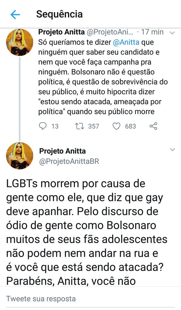 As cobranças de posicionamento aumentaram após seus seguidores constatarem que a cantora seguiu um perfil no Instagram que claramente apoia o referido candidato à presidência do país.