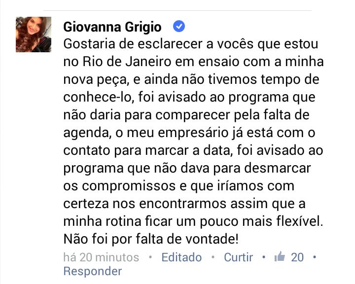 Atualizado: 19:51 Giovanna Grigio se retrata através de rede social: