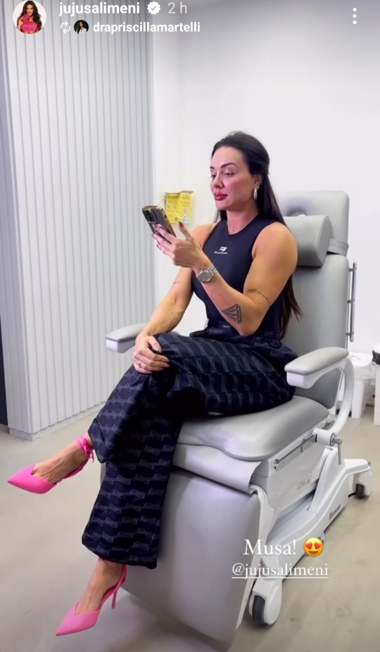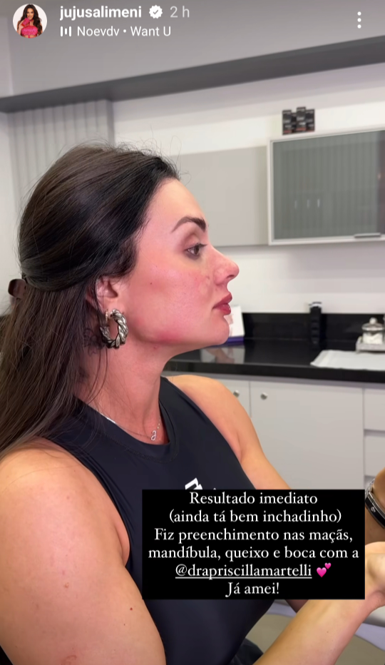 Na noite desta sexta-feira (22), Juju Salimeni fez procedimentos estéticos no rosto e mostrou o resultado em seus Stories no Instagram. Ela fez preenchimento com a especialista Priscila Martelli.