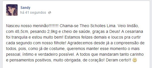 Theo Scholles Lima nasceu nesta terça-feira (24) no Rio de Janeiro. Em seu perfil no Facebook a cantora Sandy não escondeu a emoção do nascimento do seu primogênito.