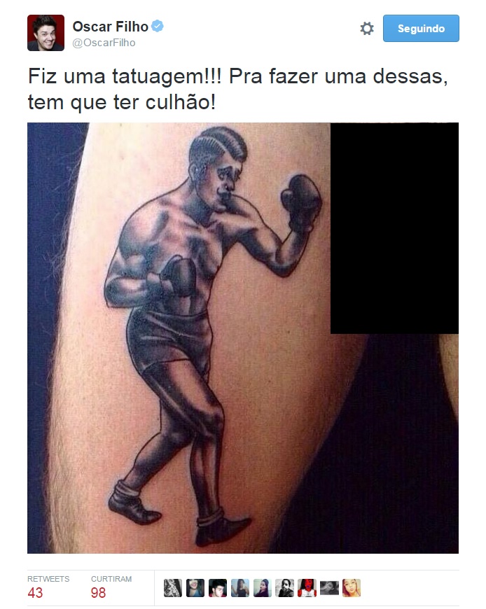 Na legenda, Oscar Filho escreveu: “Fiz uma tatuagem!!! Pra fazer uma dessas, tem que ter culhão!”. A imagem gerou comentários dos internautas. Veja a foto: