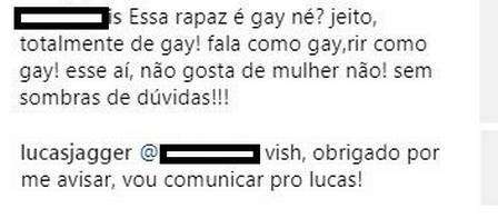 “Essa rapaz é gay, né? Jeito, totalmente de gay! Fala como gay, ri como gay! Esse aí, não gosta de mulher, não! Sem sombras de dúvidas!!!”, escreveu o seguidor de Lucas.