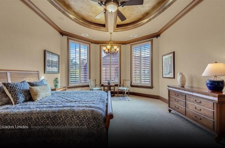 A propriedade ainda tem muitos outros atrativos, que incluem sala de estar com lareira, uma cozinha gourmet com bancada de granito e janelas que dão vista para um lago e uma fonte. Ainda há quartos com banheiros privativos, um escritório e uma sala usada como academia.
