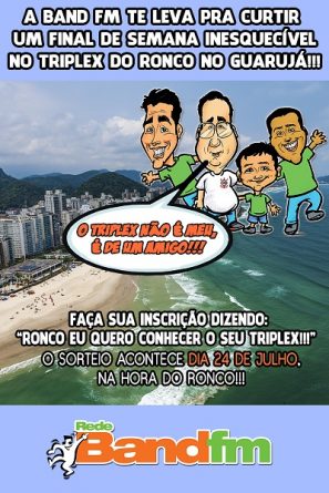A Rede Band FM irá levar um ouvinte e mais quatro pessoas para passar um final de semana no litoral de São Paulo, no luxuoso tríplex do Pedro Luiz Ronco em Guarujá. A promoção Triplex do Ronco vai tornar esse final de semana ainda mais inesquecível ao dar uma grana para o sorteado poder gastar, além de pagar por toda a alimentação e acomodação dos cinco sortudos que vão aproveitar o apartamento do apresentador do programa “A Hora do Ronco”.