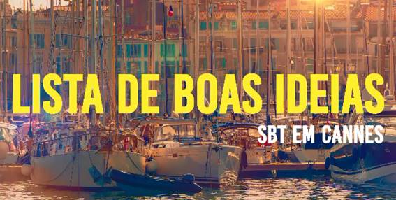 O SBT – Patrocinador global da Categoria de Filme do Cannes Lions Festival Internacional de Criatividade – fará este ano uma cobertura especial do evento, com a série “Lista de Boas Ideias”. Direto do lugar onde há mais inspiração e criatividade por metro quadrado, a emissora ouvirá durante uma semana importantes nomes do Marketing e da Publicidade, para elencar dicas e insights sobre temas chaves do mercado e do mundo corporativo.