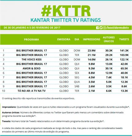 Confira os programas de TV mais comentados no Twitter de 30 de janeiro a 5 de fevereiro Alex Klein 9 de fevereiro de 2017 Compartilhar: