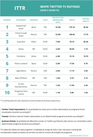 A Kantar Ibope Media divulga semanalmente o IBOPE Twitter TV Ratings (ITTR), que mensura a repercussão do conteúdo da televisão aberta no ambiente digital.