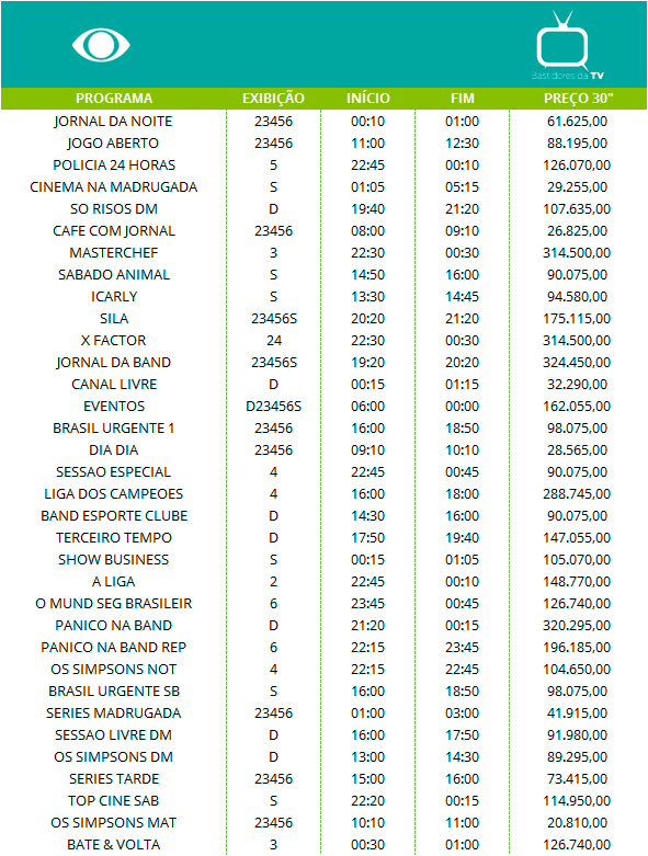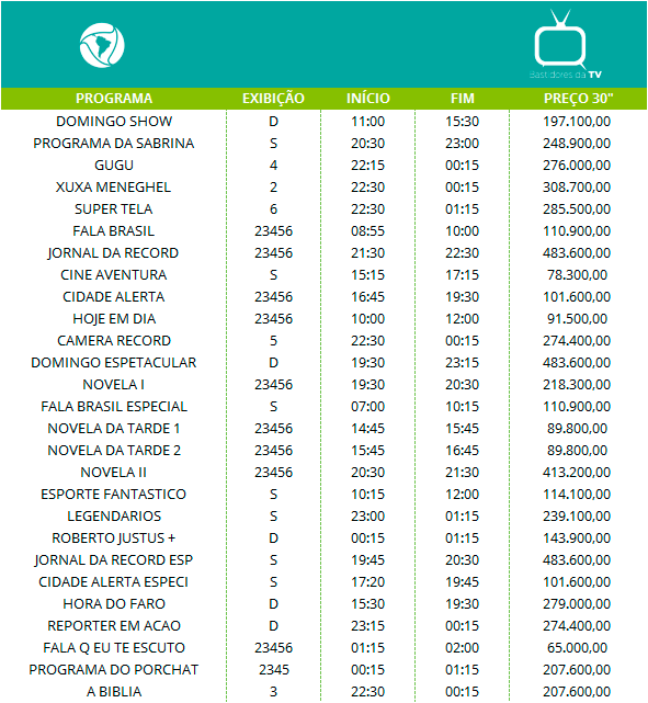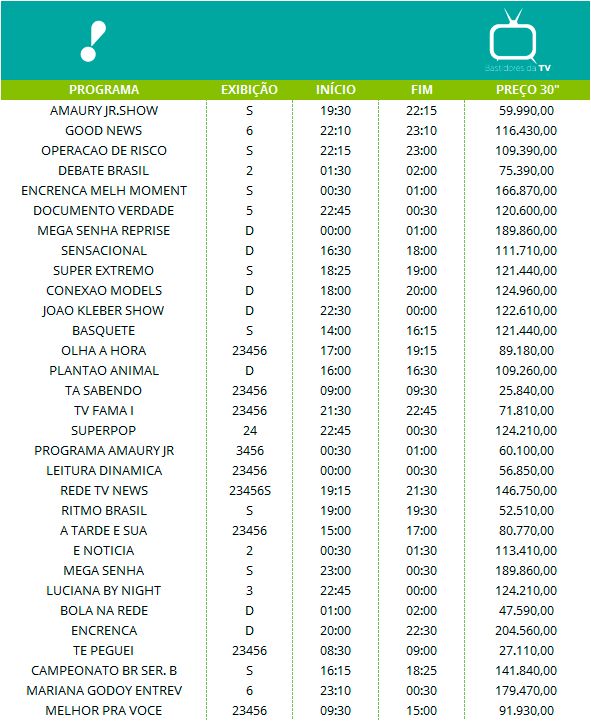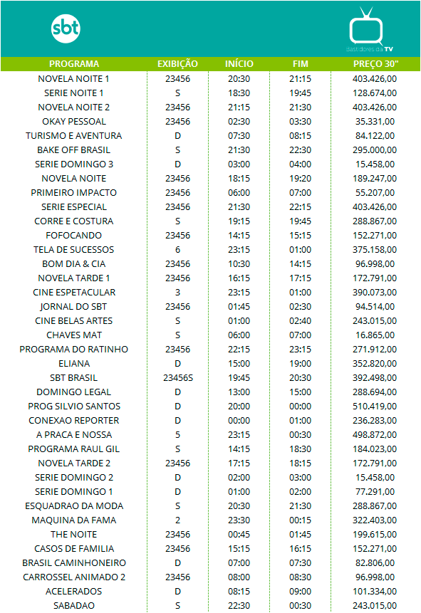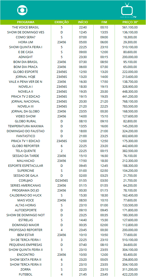 Os preços listados a seguir são os valores cobrados pelas emissoras de televisão no Brasil pelas inserções de 30 segundos em cada programa no mercado nacional, isto é, os anúncios que são veiculados em rede.