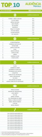 Top 10: as maiores audiências em Manaus entre os dias 3 a 9 de outubro Alex Klein 12 de outubro de 2016 Compartilhar: