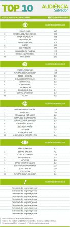 Top 10: as maiores audiências em Salvador entre os dias 29 de agosto e 4 de setembro Alex Klein 8 de setembro de 2016 Compartilhar: