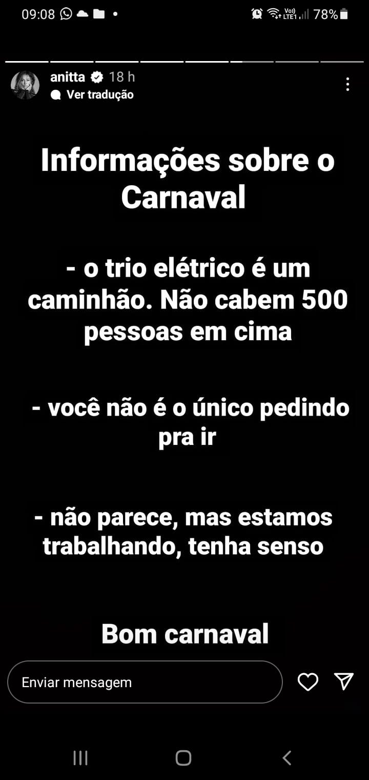 “Informações sobre o Carnaval: o trio elétrico é um caminhão, não cabem 500 pessoas. Você não é o único pedindo para ir. Não parece, mas estamos trabalhando. Tenha senso.”, pediu.