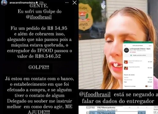“Eu sofri um golpe. Fiz um pedido de R$ 54,95 e além de cobrarem isso, alegando que não passou, pois a máquina estava quebrada, o entregador do iFood passou o valor de R$ 8.546,52”, explicou.