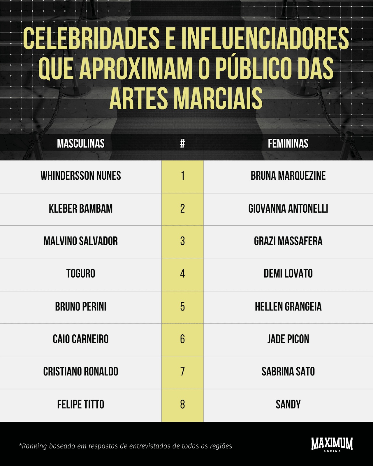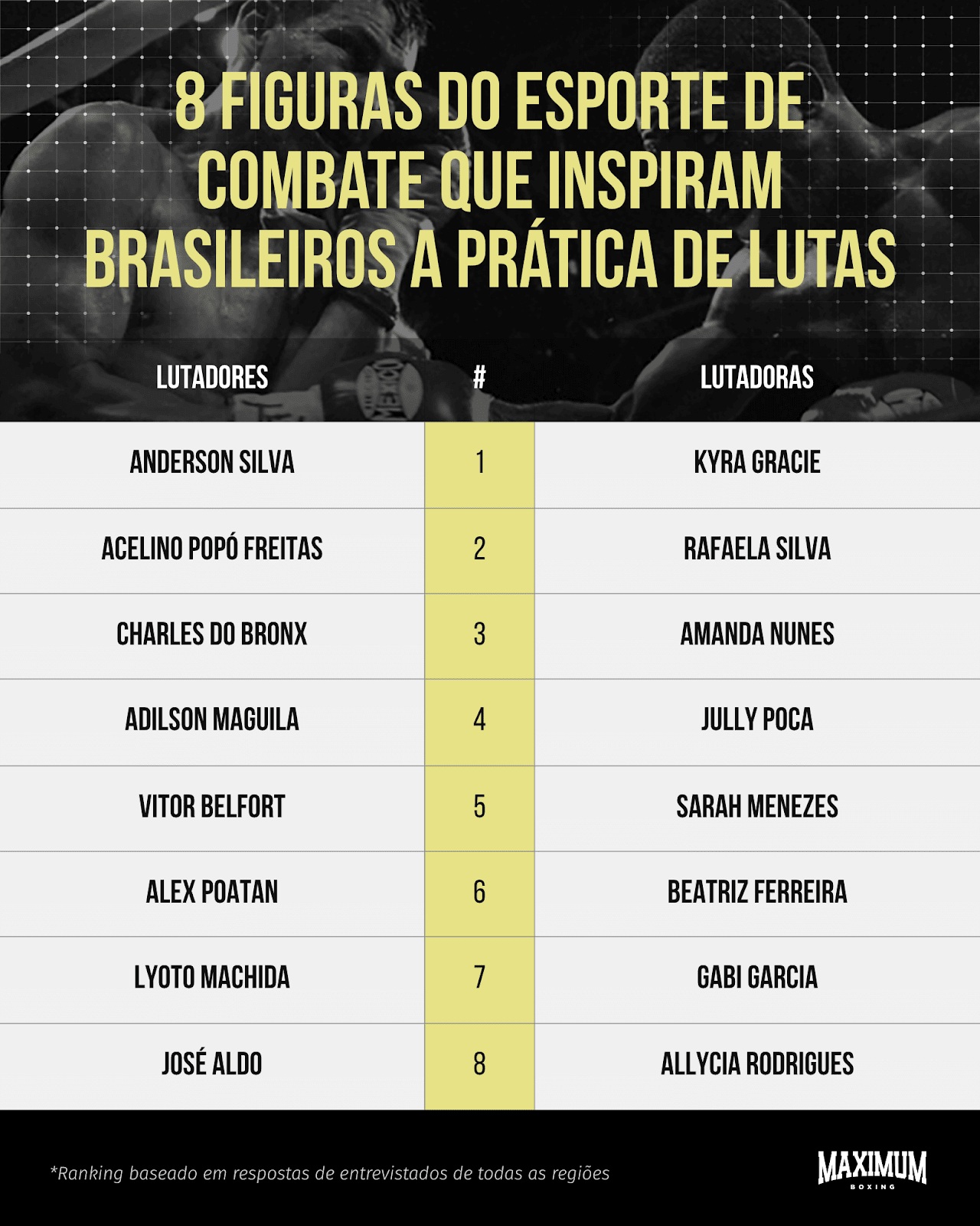 Ao reunir nomes de diferentes perfis em um mesmo levantamento, o estudo mostra que o universo das lutas está crescendo no Brasil. A inspiração se distribui entre múltiplas referências, ampliando o alcance, o significado dessas práticas e atingindo cada vez um público mais amplo.