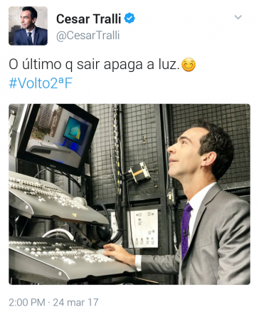 Coincidência a parte, o apresentador César Tralli, postou uma foto curiosa, em seu Twitter, nesta tarde. Teve quem brincou com o apresentador: “Tralli foi você quem tirou o JH do ar”?