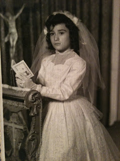 Sônia em dos momentos na infância, fazendo pose com um lindo vestido e em sua primeira comunhão