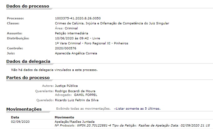 De acordo com a movimentação do processo, disponível para consulta pública no site do Tribunal de Justiça de São Paulo, a queixa crime foi rejeitada pela juíza Aparecida Angélica Correia, da 1ª Vara Criminal de Pinheiros.