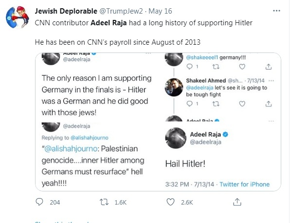 Mais um grande veículo de imprensa global sofre constrangimento devido a postagens de seus profissionais em redes sociais. Desta vez a vítima foi a emissora CNN, que dispensou no domingo (16/05/2021) o jornalista paquistanês Adeel Raja depois de postagens elogiando Adolf Hitler e suas tentativas de aniquilar o povo judeu.