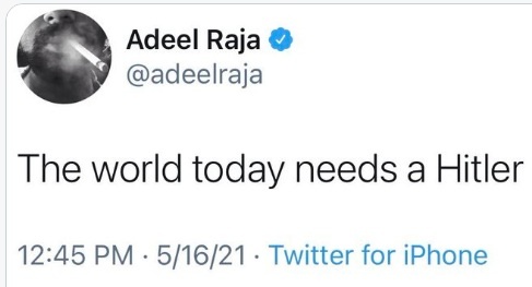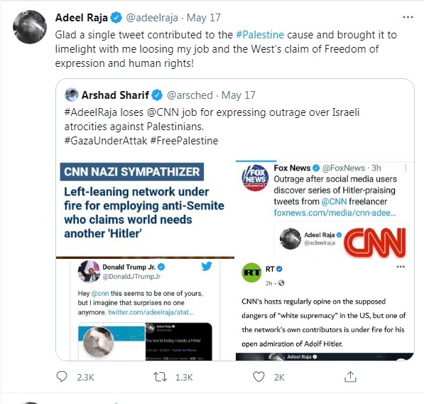 Adeel Raja não acusou o golpe. Depois de ser demitido, postou: “um único tweet contribuiu para a causa da Palestina e trouxe-a para os holofotes junto com a minha perda do emprego”. Ele ainda reclamou que o Ocidente apoia a liberdade de expressão e os direitos humanos, mas diz ter sido demitido por causa de seus tweets pró-Hitler.